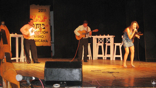 Canta, se presenta acompañada de dos guitarras, en 1º guitarra